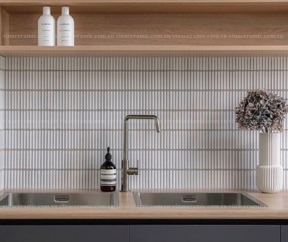 Một ưu điểm lớn khác là dễ vệ sinh, bảo dưỡng. Bề mặt gạch mosaic thanh que thường nhẵn bóng, ít bám bẩn, chỉ cần lau chùi đơn giản là có thể trả lại độ sáng mới. Nhờ vậy, không gian luôn giữ được vẻ sạch sẽ, sang trọng mà không mất nhiều thời gian chăm sóc.